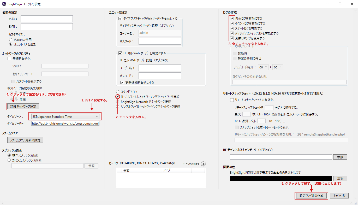 ※注意2) Bright Sign本体がPCと通信ができるよう、あらかじめ設定しておく必要があります。Bright Sign本体のネットワーク設定