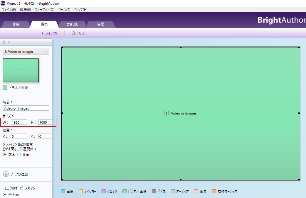 2つのFull-HDビデオの同時再生 | 2つのFull-HDビデオの同時再生は、現在ではBrightAuthor : connectedを使用し、ターゲット解像度を1920×1080に設定した場合のみ可能。通常のBrightAuthorにおいては、今後のアップデートで対応予定。 |