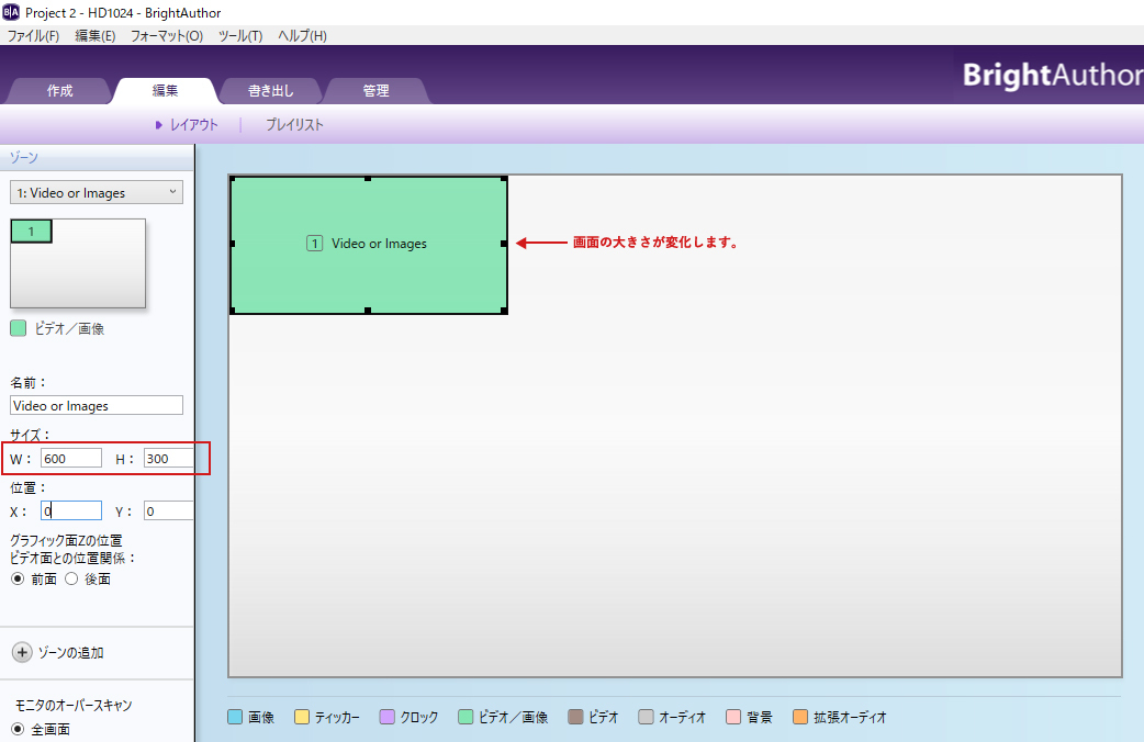 この設定では、Brght Signからの出力サイズは(W)1,920 × (H)1,080ですが、映像が表示されている範囲は、画面左上の(W)600 × (H)300の部分のみとなります。